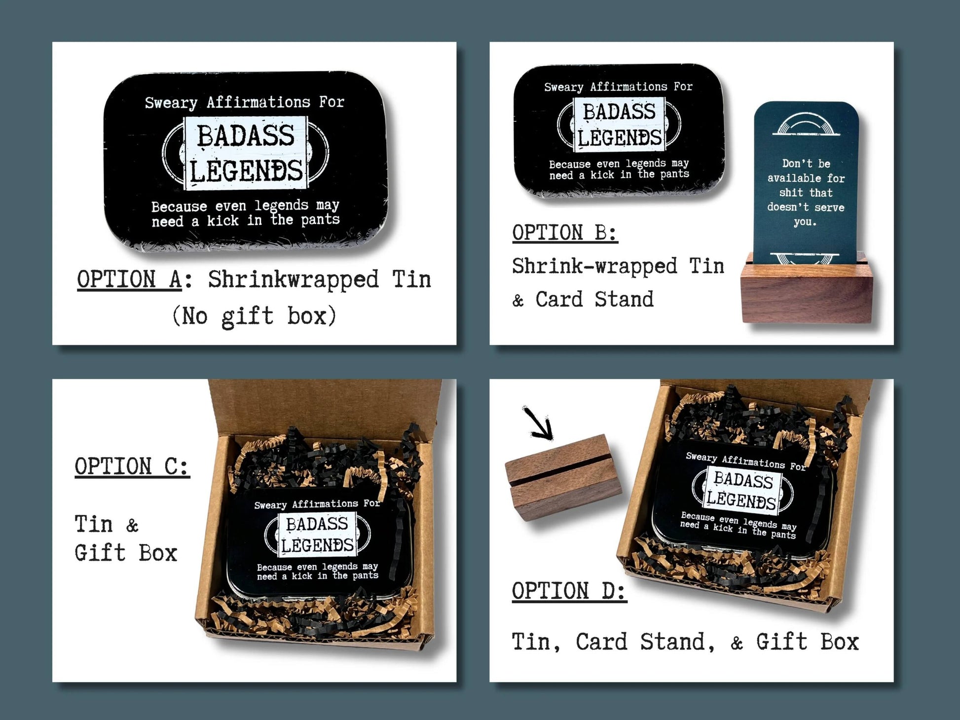 Option B: A shrink-wrapped tin with cards and a card stand to display individual cards